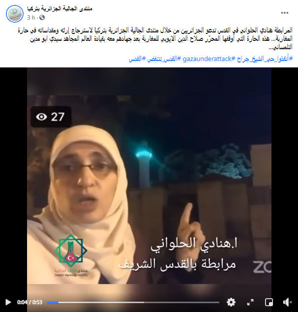 وخاطبت المرابطة هنادي الحلواني الجزائريين من خلال من خلال منتدى الجالية الجزائرية بتركيا وقالت: “جنود الاحتلال اقتحموا مئذنة المغاربة، وعندما أقول المغاربة أشعر وكأني أتحدث إليكم”.