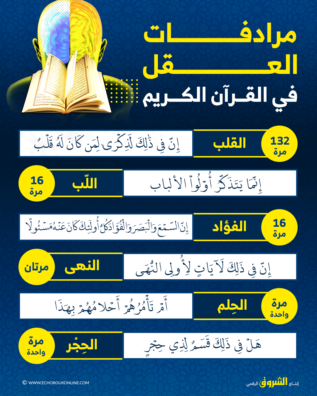 في صيغته الاسمية لم يرد في القرآن مطلقاً.. تعرف على مرادفات “العقل” كما وردت في كتاب الله.