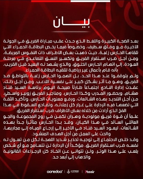 وعقدت إدارة “الحمراوة”، الإثنين، اجتماعا مع الحارس زغبة للرفع من معنوياته. وهدّدت بِمقاضاة مَن يتّهمونه بِترتيب نتيجة المباراة.
