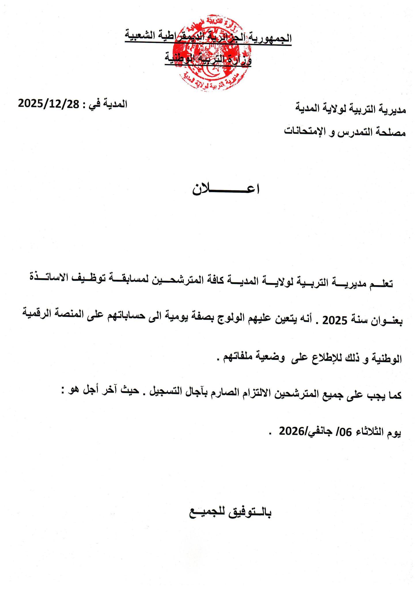 يتعين على المترشحين المشاريكين في مسابقة توظيف الأساتذة بعنوان سنة 2025، الولوج إلى حساباتهم على المنصة الرقمية، بصفة يومية، للإطلاع على وضعية ملفاتهم، حسب ما دعت إليه مديريات التربية.