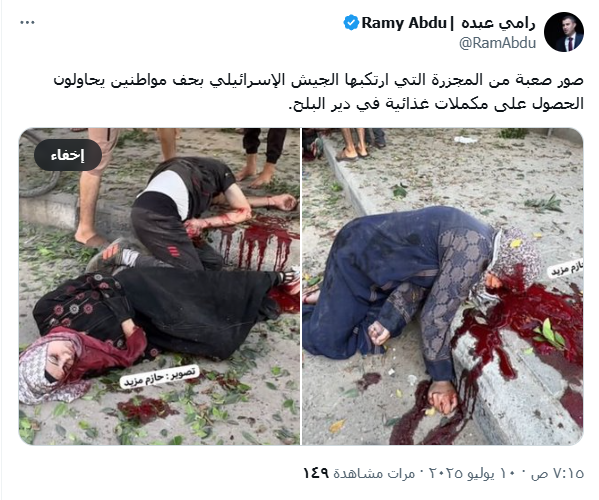 مشاهد صادمة.. مجزرة دامية بحق طالبي المساعدات في دير البلح