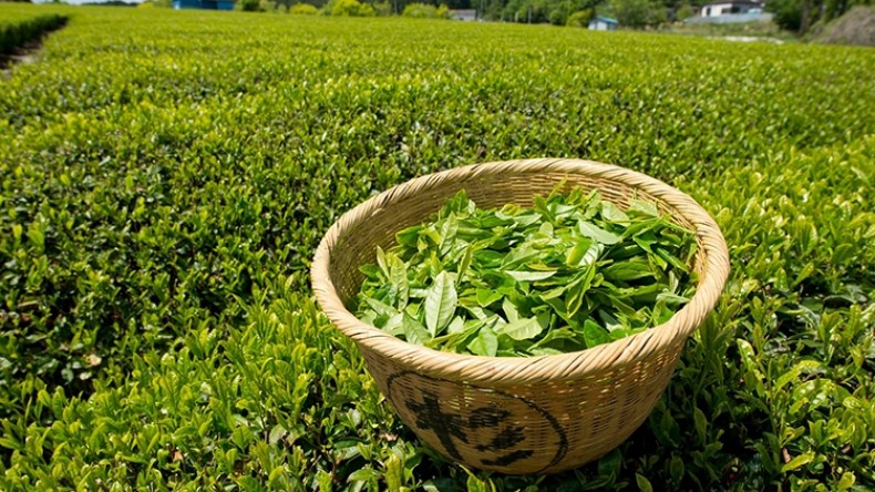 سلة من أوراق الشاي الأخضر الطازجة المقطوفة في مزرعة في اليابان