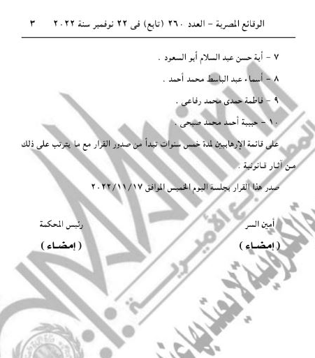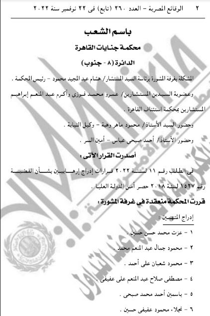 وقالت الصحيفة إن الدائرة الثامنة بمحكمة جنايات جنوب القاهرة، والمنعقدة بغرفة المشورة، برئاسة المستشار هشام عبد المجيد وعضوية المستشارين عمرو محمد فوزي وأكرم عبد المنعم، قررت إدراج 10 أشخاص على قوائم الإرهاب، بينهن 6 نساء، اثنان منهن شقيقتان.