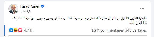 وقال فرج عامر في منشور على فيسبوك يوم 20 أفريل:”تذكروا أنني أول من قال إن مباراة السنغال ومصر ستعاد”.