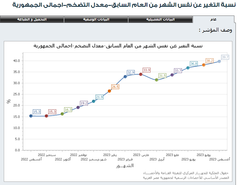وقد بلغ التضخم في مصر خلال شهر أوت الماضي معدل 39.7 بالمئة، بعد أن كان 38.2 بالمئة شهر جويلية، حسب منحى التضخم الذي نشره الجهاز. وهو منحنى يبدو أنه مستمر في الصعود.
