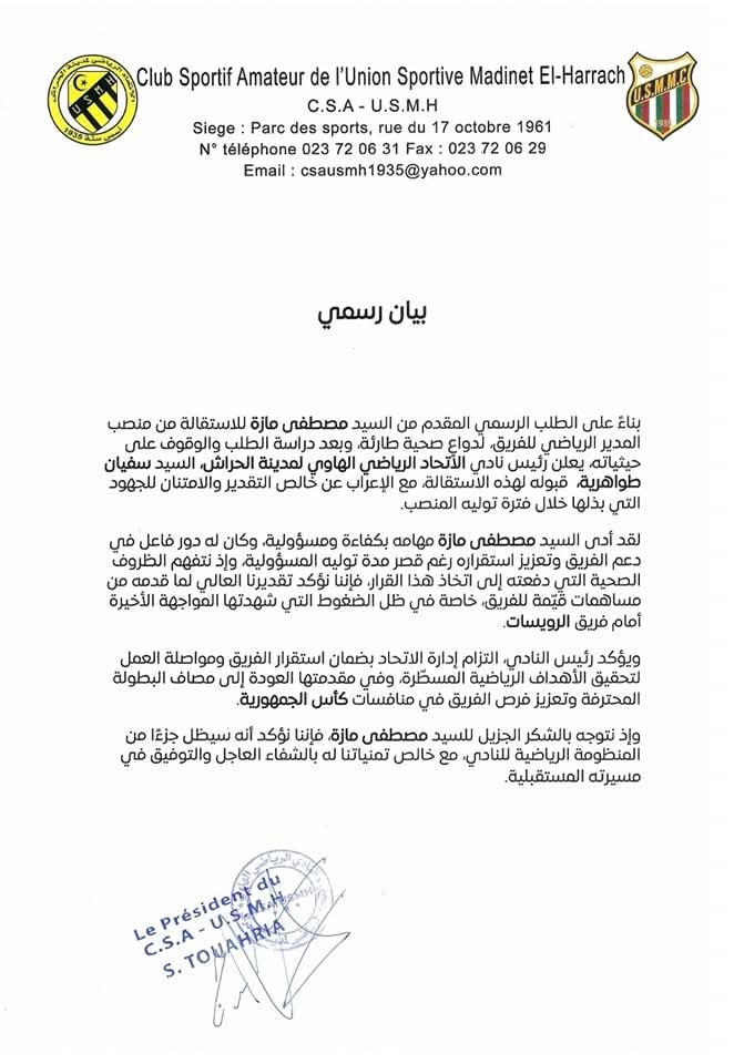 استقال المدير الرياضي لاتحاد الحراش، مصطفى مازة من منصبه، في الفريق، لأساب صحية.