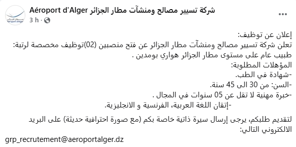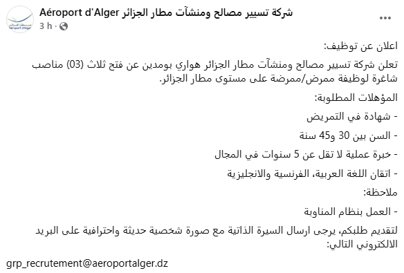 ودعت شركة تسيير مصالح ومنشآت مطار الجزائر هواري بومدين الراغبين في الترشح إلى إرسال سيرهم الذاتية مرفقة بصورة شخصية حديثة واحترافية عبر البريد الإلكتروني التالي: [email protected].