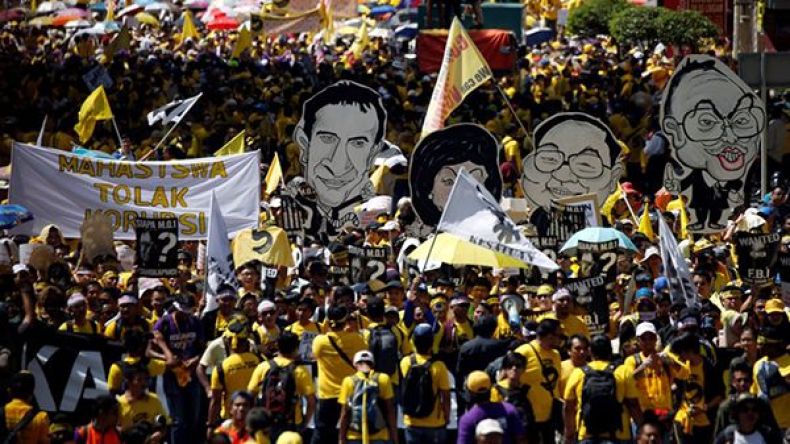 تظاهر عشرات الآلاف من المناهضين للحكومة الماليزية في العاصمة كوالالمبور، السبت، مطالبين باستقالة رئيس الوزراء نجيب عبد الرزاق، بسبب تورطه المزعوم في فضيحة اختلاس عدة مليارات من الدولارات.