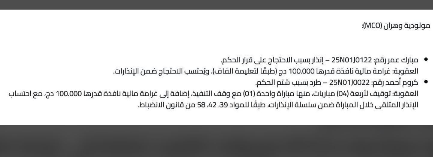 سلّطت لجنة الانضباط، الجمعة، عقوبة على لاعبَي فريقَي مولودية وهران أحمد كروم وشباب قسنطينة الهواري بعوش.