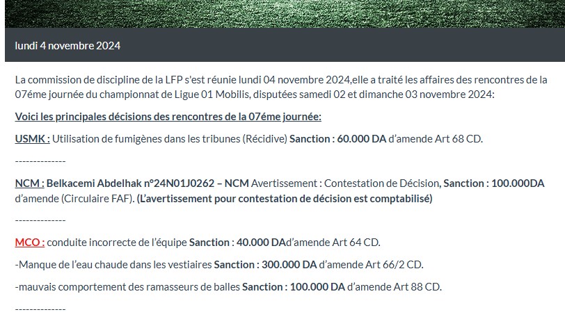 وسلطت لجنة الانضباط على مولودية وهران عقوبة مالية قدرها 30 مليون سنتيم، بسبب عدم توفر الماء الساخن، في غرف تغيير الملابس، بمناسبة لقاء الفريق أمام شباب قسنطينة، لحساب الجولة السابعة.