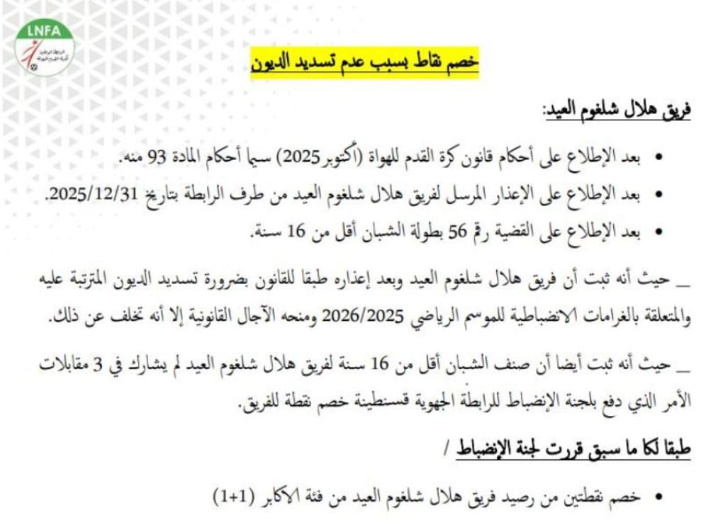 عاقبت رابطة الكرة لِقسم الهواة فريق هلال شلغوم العيد، الذي ينشط في بطولة القسم الثاني فوج “وسط- شرق”.