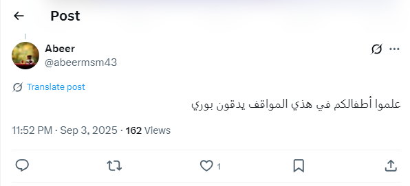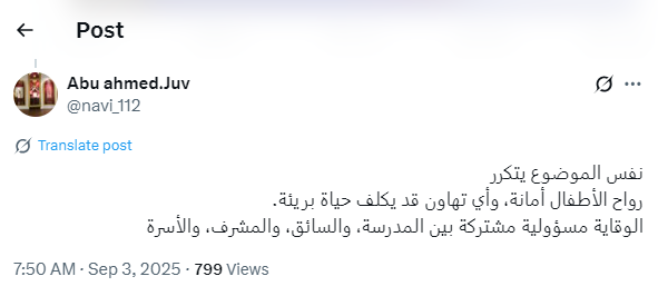 “نفس الموضوع يتكرر، أرواح الأطفال أمانة، وأي تهاون قد يكلف حياة بريئة، الوقاية مسؤولية مشتركة بين المدرسة، والسائق، والمشرف، والأسرة”.