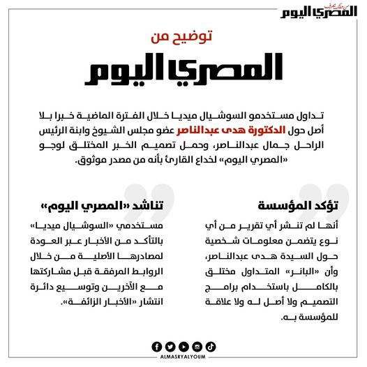 ونفت صحيفة المصري اليوم، ما تم تداوله حول ثروة هدى عبد الناصر، وقالت الصحيفة إنها “لم تنشر أي تقرير من أي نوع يتضمّن معلومات شخصية حول السيدة هدى عبد الناصر”.