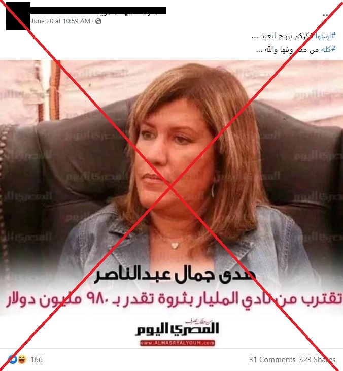 ونشرت بعض الصفحات الالكترونية صورة توحي بأنها من إحدى المنصات الإلكترونية لجريدة ” المصري اليوم” وجاء في الخبر أن ” هدى عبد الناصر تقترب من نادي المليار بثروة تقدر بـ 980 مليون دولار”.
