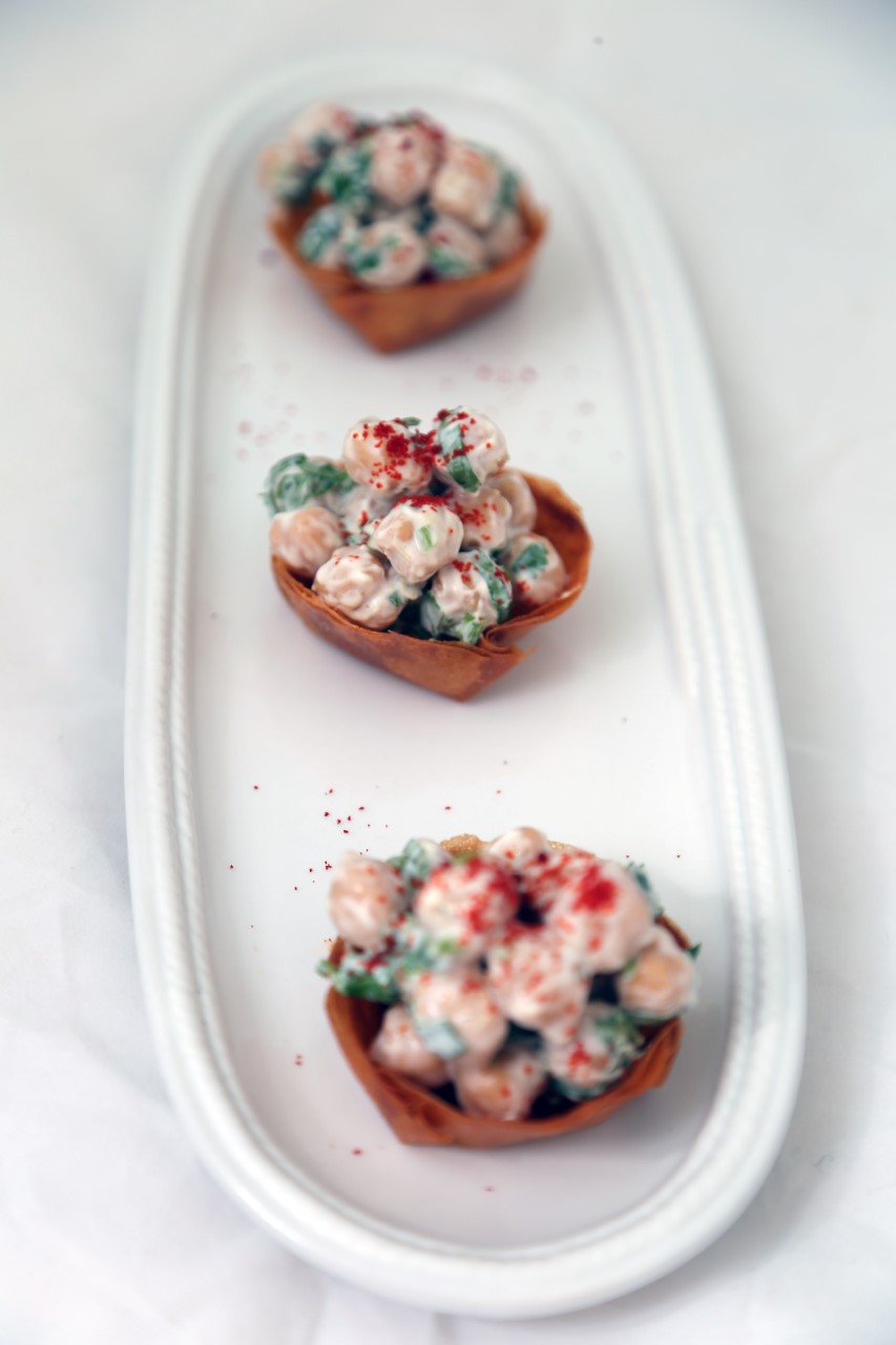 نأخذ أوراق الديول نقطعها على شكل دوائر ثم نأخذ قوالب دائرية الشكل ندهنها بالزبدة الذائبة ثم نضع ثلاثة طبقات من أوراق الديول و ندهن بين كل طبقة و طبقة أخرى ثم ندخلها الفرن كي تأخذ اللون الذهبي و في ذلك الوقت في وعاء نضع الزبادي و نضيف له القصبر و النعناع و فص الثوم المهروس و زيت الزيتون و عصير الليمون و الملح و نخلط جميع المقادير ثم في الأخير نضيف الحمص المسلوق و نخلط عندما تنضج أوراق الديول نتركها تبرد قليلا ثم نضع داخلها خليط الحمص و نزينها بالفلفل الأحمر .