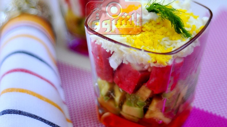 -تبليها بزيت الزيتون، ملعقة ليمون وملح، ضعيها أسفل مكعب التقديم الزجاجي، ضفي قطع “سوريمي” على الأطراف.