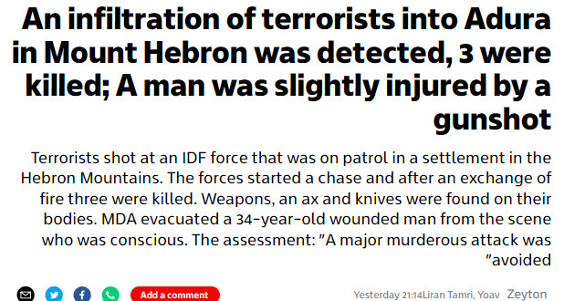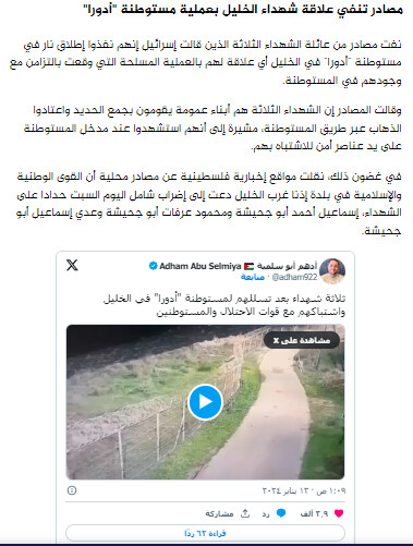 ووفقًا للصحافة العبرية فقد تم رصد تسلل ثلاثة فلسطينين إلى مستوطنة أدورا قرب الخليل، مساء يوم الجمعة 11 جانفي، وأطلقوا النار على قوات من الجيش الإسرائيلي، مما أدى إلى مقتل الفلسطينيين، وإصابة إسرائيلي قال الجيش الإسرائيلي إنه من جنود الاحتياط.