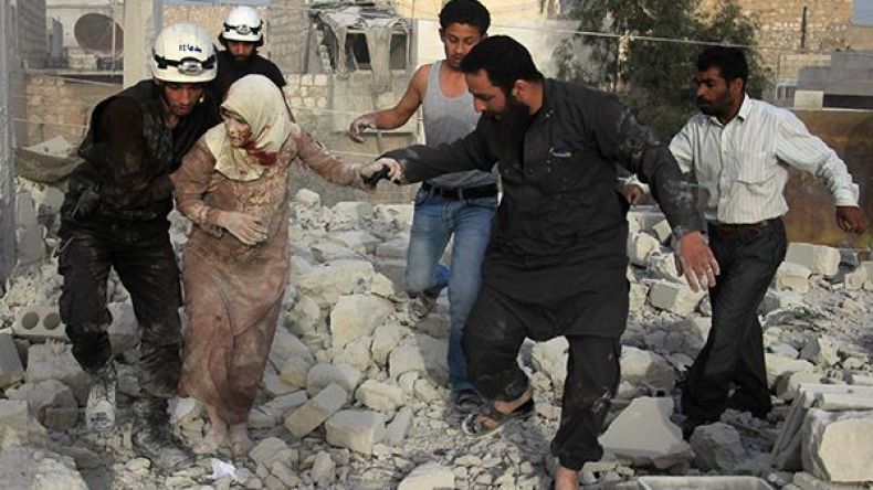 رجال إنقاذ يقومون بإجلاء جريحة وسط دمار في حي الحيدرية شمال حلب - 10 أفريل 2016