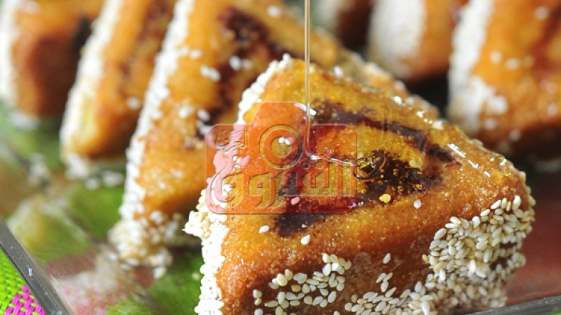 المقروط في زيت ساخن وغزير واتركيه يتحمر ثم اغمسيه مباشرة في العسيلة ومرري الأطراف في الجلجلان.