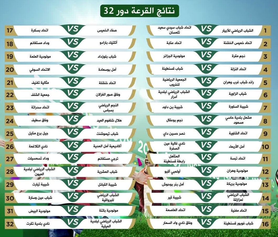 سحب الاتحاد الجزائري لِكرة القدم مساء الثلاثاء قرعة منافسة كأس الجمهورية، في دورها الـ 32.
