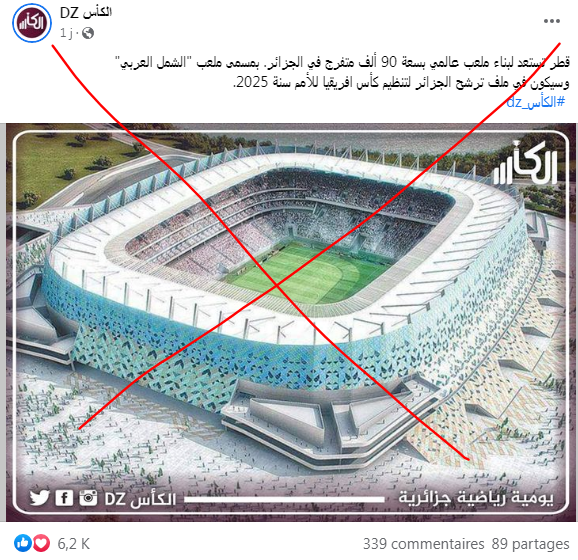 تداول مستخدمون لمواقع التواصل الاجتماعي صورا ومنشورات، لما يفترض أنه ملعب كبير لكرة القدم، يتّسع لـ90 ألف متفرّجا، تستعدّ قطر لتشييده في الجزائر.