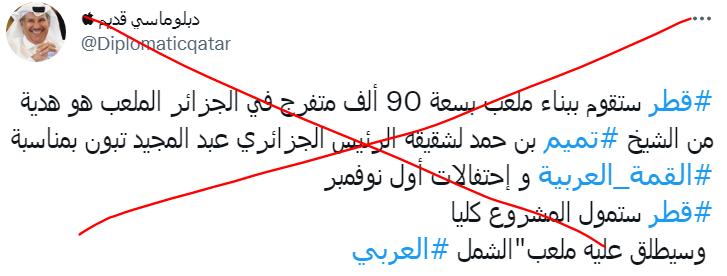 لكن برنامج زيارة الأمير القطري إلى الجزائر، لم يتضمّن أي إشارة إلى مشروع من هذا القبيل. فضلا عن أن الصورة المتداولة للملعب “الافتراضي”، تعود إلى ملعب معروف في البرازيل.
