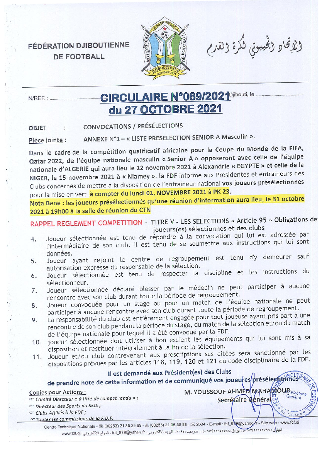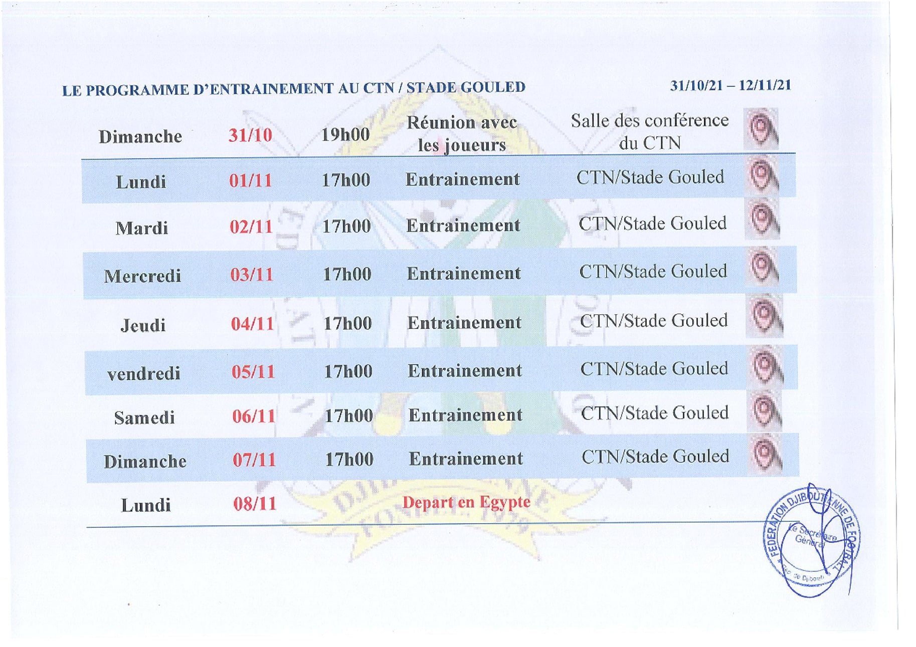 وبرمج الطاقم الفني لمنتخب جيبوتي بقيادة، المدرب المؤقت محمد حسن مرانه، تربصا تحضيرا ينطلق سهرة الأحد بعقد اجتماع تقني، قبل الالتحاق بمركز التدريب بجيبوتي، للتحضير هناك إلى غاية يوم 8 نوفمبر.
