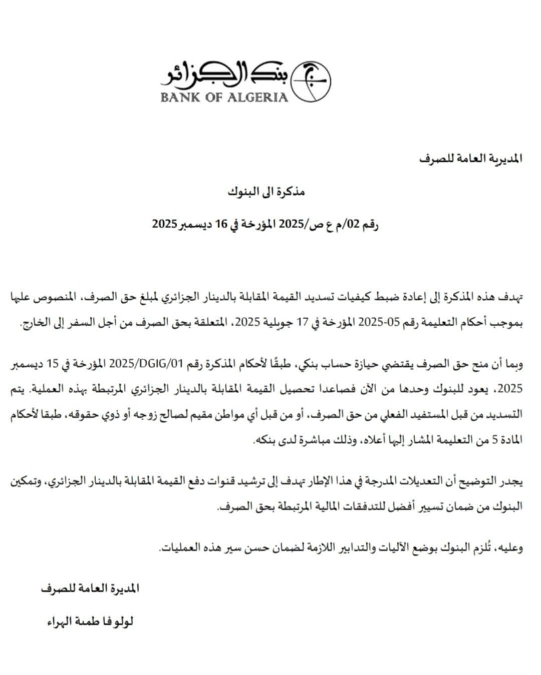 وأوضحت المذكرة رقم 02/م ع ص/2025 المؤرخة في 16 ديسمبر 2025، أن هذه الإجراءات تندرج ضمن تطبيق أحكام التعليمة رقم 05-2025 المؤرخة في 17 جويلية 2025، والمتعلقة بحق الصرف من أجل السفر إلى الخارج، مع إدخال تعديلات تخص طرق تحصيل المقابل بالدينار الجزائري.