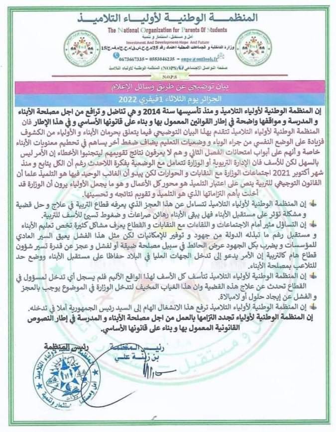 نددت المنظمة الوطنية لأولياء التلاميذ باستمرار احتجاز كشوفات نقاط التلاميذ للفصل الأول إلى غاية الساعة، وهذا على إثر احتجاج الأساتذة ورفضهم تسليمها.