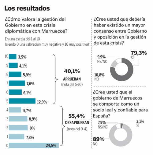وحول الأزمة مع المغرب قال 55 بالمائة من المستجوبين أنهم غير راضين على طريقة إدارة حكومتهم لها، فيما وافق 40 بالمائة منهم على خطوات الحكومة الاسبانية بعد الأزمة الأخيرة والتي صل خلالها قرابة 10 آلاف مغربي إلى اسبانيا.