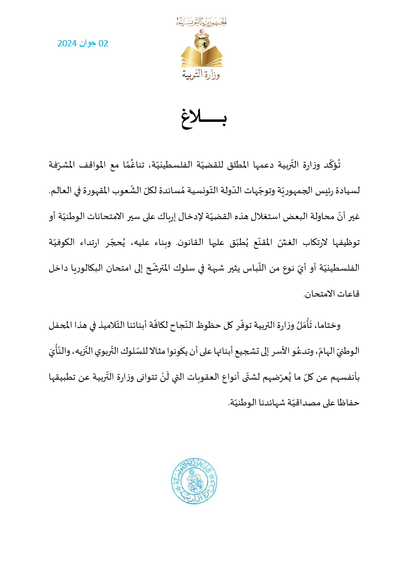 وشددت الوزارة على أن هناك محاولات “لاستغلال مواقف وتوجهات الدولة التونسية لمساندة فلسطين وكل الشعوب المقهورة في العالم، من خلال محاولة البعض استغلال هذه القضية لإدخال إرباك على سير الامتحانات الوطنية”.