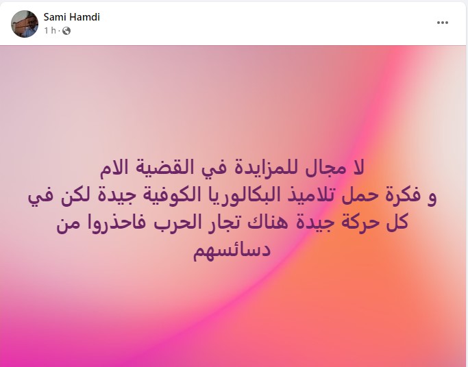 في ذات السياق انتشرت عبر منصات التواصل الاجتماعي منشورات مماثلة تدعو الطلبة لاجتياز امتحان شهادة البكالوريا في الجزائر بتوشح الكوفية الفلسطينية نصرة للقضية.