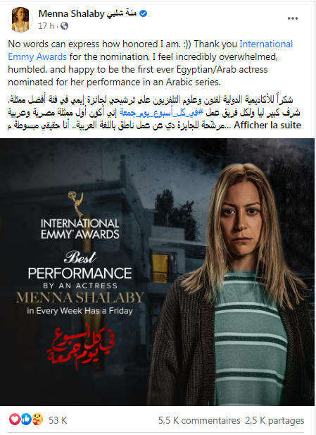وقالت منة عبر حسابها الرسمي على فيسبوك: “شكرا للأكاديمية الدولية لفنون وعلوم التلفزيون على ترشيحي لجائزة إيمي في فئة أفضل ممثلة.