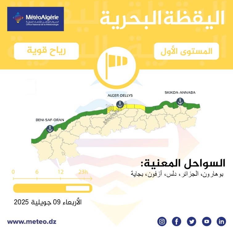 وحسب تنبيه للديوان الوطني للأرصاد الجوية من المستوى الأول باللون الأصفر على خريطة اليقظة، فإن السواحل المعنية بالرياح العاتية هي: بوهارون، الجزائر، دلس، أزفون، بجاية.
