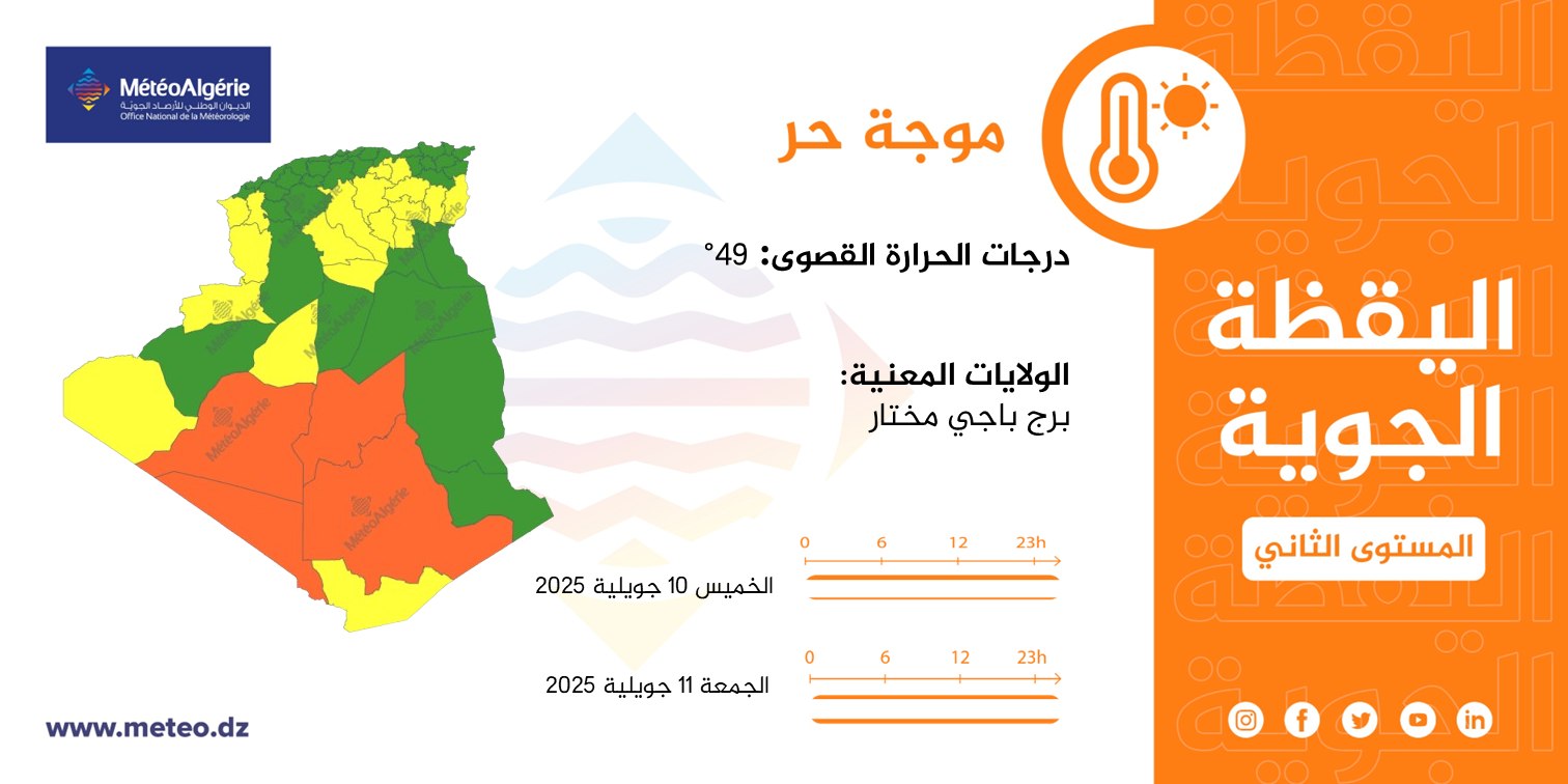 وحسب تنبيه للديوان الوطني للأرصاد الجوية من المستوى الثاني باللون البرتقالي على خريطة اليقظة، فإن الولايات المعنية بموجة الحر التي تصل إلى 49 درجة مئوية يومي الخميس والجمعة: برج باجي مختار، أدرار، عين صالح وغرب تمنراست