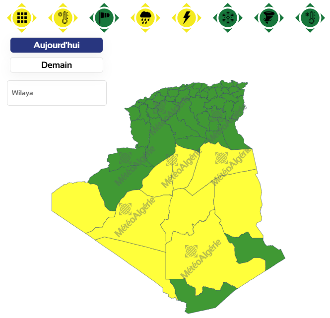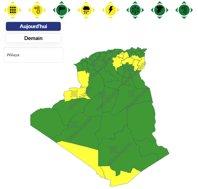وحسب تنبيه للديوان الوطني للأرصاد الجوية من المستوى الأول باللون الأصفر على خريطة اليقظة، فإن الولايات المعنية بموجة الحر من الساعة السادسة صباحًا من اليوم الأربعاء إلى غاية الساعة السادسة صباحا من يوم غد الخميس هي: إيليزي، ورقلة، المنيعة، تمنراست، عين صالح، تيميمون، أدرار، برج بوعريريج وتيندوف.
