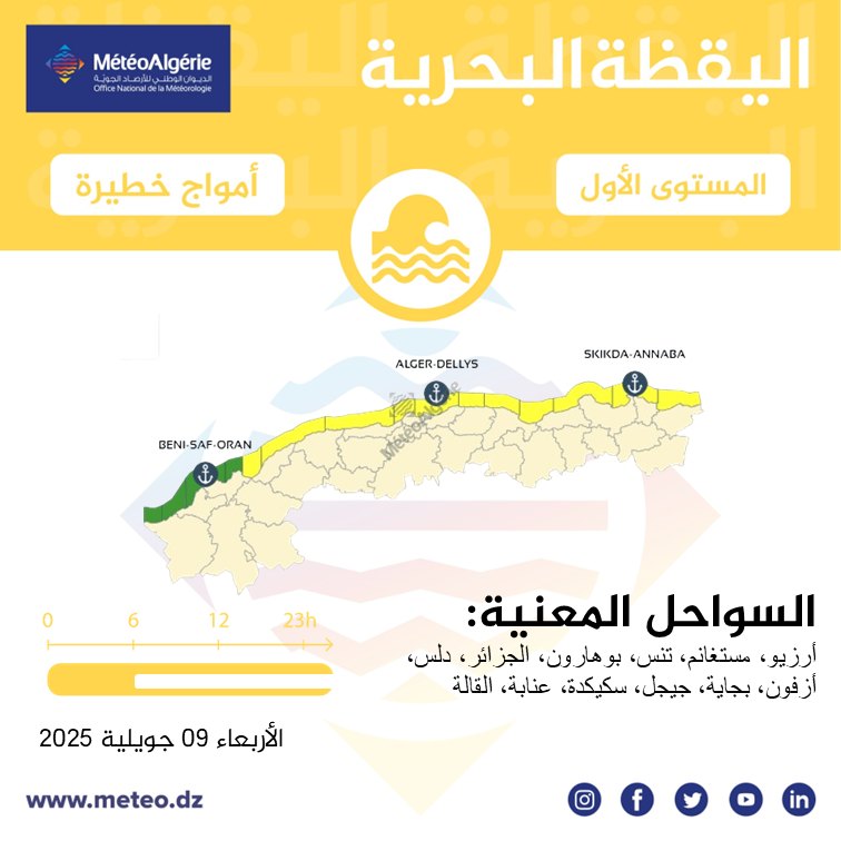 وحسب تنبيه آخر من المستوى الأول باللون الأصفر على خريطة اليقظة فإن السواحل المعنية بالأمواج الخطيرة هي: أرزيو، مستغانم، تنس، بوهارون، الجزائر، دلس، أزفون، بجاية، جيجل، سكيكدة، عنابة، القالة.