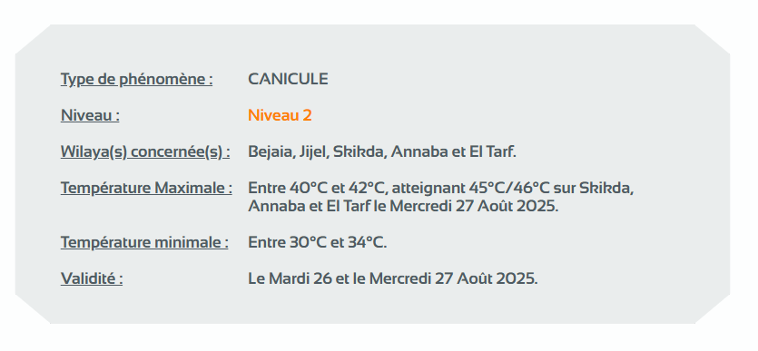وحسب تنبيه للديوان الوطني للأرصاد الجوية من المستوى الثاني باللون البرتقالي على خريطة اليقظة، فإن الولايات المعنية بموجة الحر التي تتراوح بين 40° و42° درجة وتصل إلى 46° بداية من اليوم الثلاثاء إلى غاية يوم غد الأربعاء هي: بجاية، جيجل، سكيكدة، عنابة والطارف.