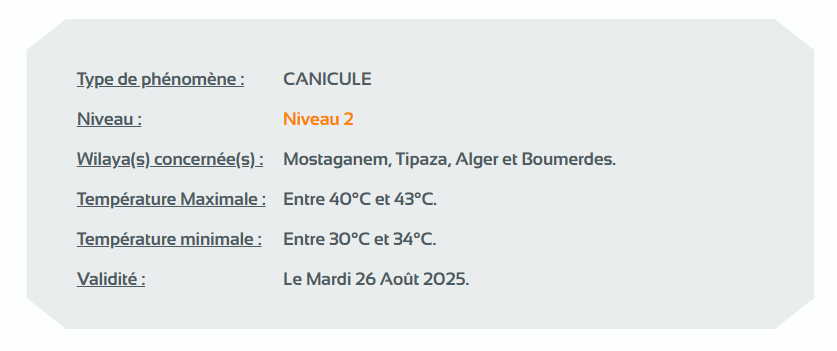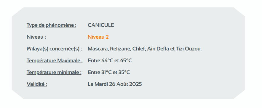 وحسب تنبيه آخر للديوان الوطني للأرصاد الجوية من المستوى الثاني باللون البرتقالي على خريطة اليقظة، فإن الولايات المعنية بموجة الحر التي تتراوح بين 44° درجة مئوية وتصل إلى 45° من اليوم الثلاثاء هي: معسكر، غليزان، الشلف، عين الدفلى وتيزي وزو.