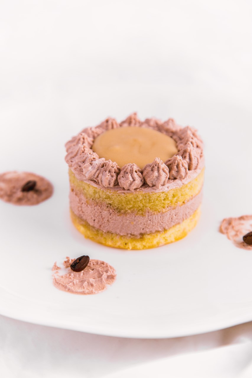 نأخذ البسكويت ونقطعه بواسطة قالب تقطيع على شكل دوائر ثم نضع القطعة الأولى داخل قالب التقطيع وندهنها بشراب السكر ثم نضع فوقها قليلا من كريمة الشانتيي، ثم نضع قطعة أخرى من البسكويت ثم ندهنها بشراب السكر ونكرر نفس العملية ونضع فوقها قطعة البسكويت الثالثة والأخيرة ثم نزين بواسطة كيس حلواني وبكريمة الشانتيي ونضع طلاء القهوة فوق قطعة الحلوى (أنظري الصورة).