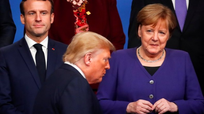 المستشارة الألمانية أنغيلا ميركل والرئيس الأمريكي دونالد ترامب والرئيس الفرنسي إيمانويل ماكرون خلال قمة لحلف شمال الأطلسي في واتفورد ببريطانيا يوم 4 ديسمبر 2019