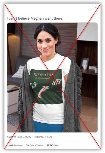وقد حازت التغريدة التي نشرت صورة ميغان وهي ترتدي قميصا أبيض يحمل عباراة “The Queen Is Dead” على أكثر من 27000 إعجاب، علما أن العبارة هي عنوان ألبوم شهير لفرقة الروك الإنجليزية The Smiths.