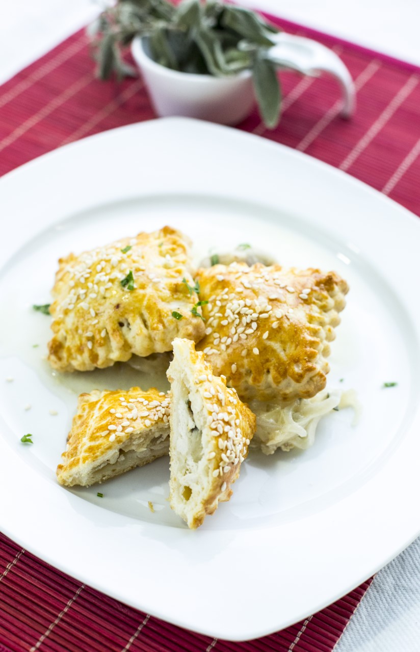 ونغطيها بمربع آخر من العجينة، ثم بواسطة شوكة نرص على الحواف لغلقها، نزينها بصفار البيض والجلجلان ثم نضعها في صينية فرن مرشوشة بالفرينة وندخلها الفرن على درجة حرارة 160.