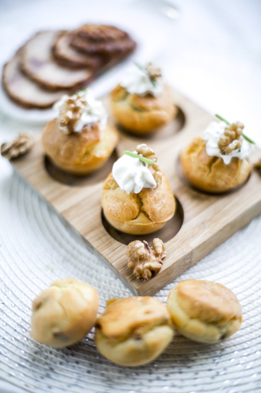 في وعاء نخفق البيض، الزبدة الذائبة، الحليب والملح، نخلط جيدا ثم نضيف الفرينة و الخميرة الكيميائية، نواصل الخفق حتى نتحصل على خليط متجانس ثم نضيف عجينة الدجاج المدخن مقطع مكعبات والجوز المدشش ثم نخلط جميع المقادير، نفرغ الخليط في قوالب السيليكون ثم ندخلها للفرن على درجة حرارة 180 لتطهى، بعد إخراجها نتركها تبرد .
