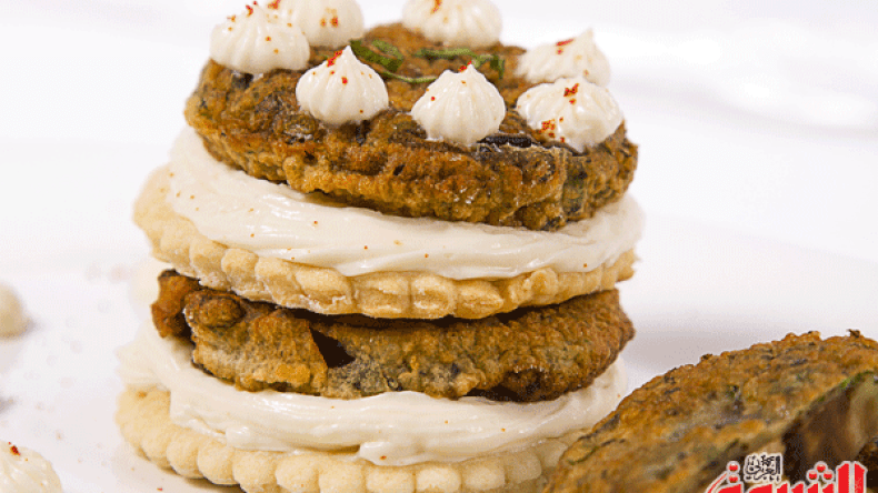 في صحن التقديم، نضع العجينة ثم قليلا من كريمة الجبن ثم قطعة باذنجان ثم الكريمة ثم العجينة ثم الكريمة. وفي الأخير، نضع قطعة باذنجان ونزينها بالكريمة بواسطة كيس حلواني. انظري الصورة.