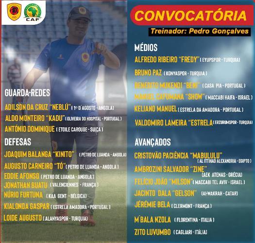 كشف النّاخب الوطني الأنغولي بيدرو غونسالفس بعد ظهيرة الأحد، عن قائمة لاعبيه الذين سيُشاركون في نهائيات كأس أمم إفريقيا، نسخة كوت ديفوار.