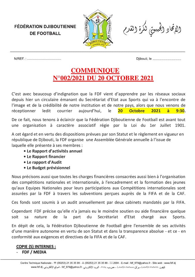 واختتمت هيئة الرئيس حسن وابري تقول، إن اتحاد الكرة الجيبوتي ينشط بِاستقلالية تامّة، وبِشفافية مُطلقة، ضمن إطار لوائح الاتحادَين الدولي الإفريقي لكرة القدم.