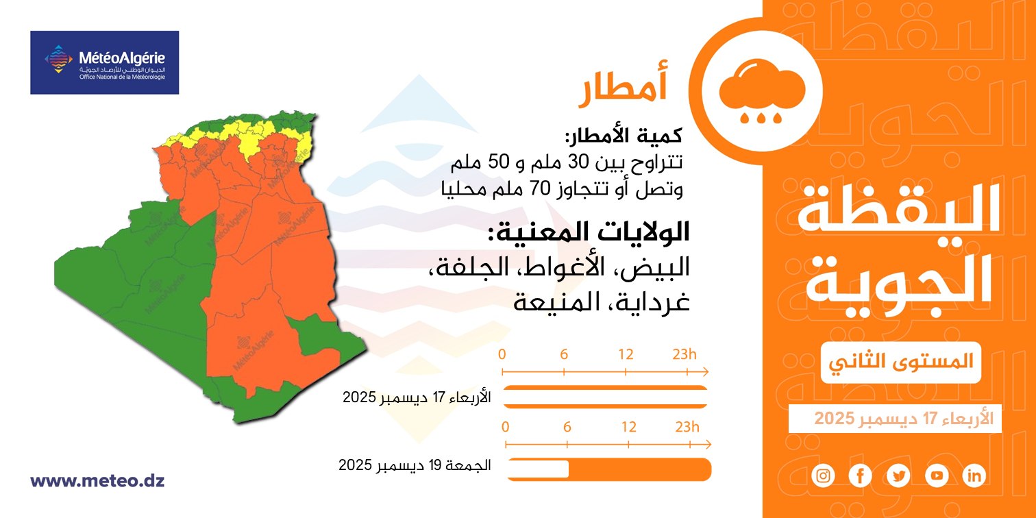 وحسب تنبيه للديوان الوطني للأرصاد الجوية من المستوى الثاني باللون البرتقالي على خريطة اليقظة، فإن الولايات المعنية بتساقط الأمطار التي تتراوح بين 30 ملم و50 ملم وقد تصل أو تتجاوز محليا الـ 70 ملم إلى غاية الساعة السادسة صباحا من يوم غد الجمعة هي: البيض، الأغواط، الجلفة، غرداية والمنيعة.