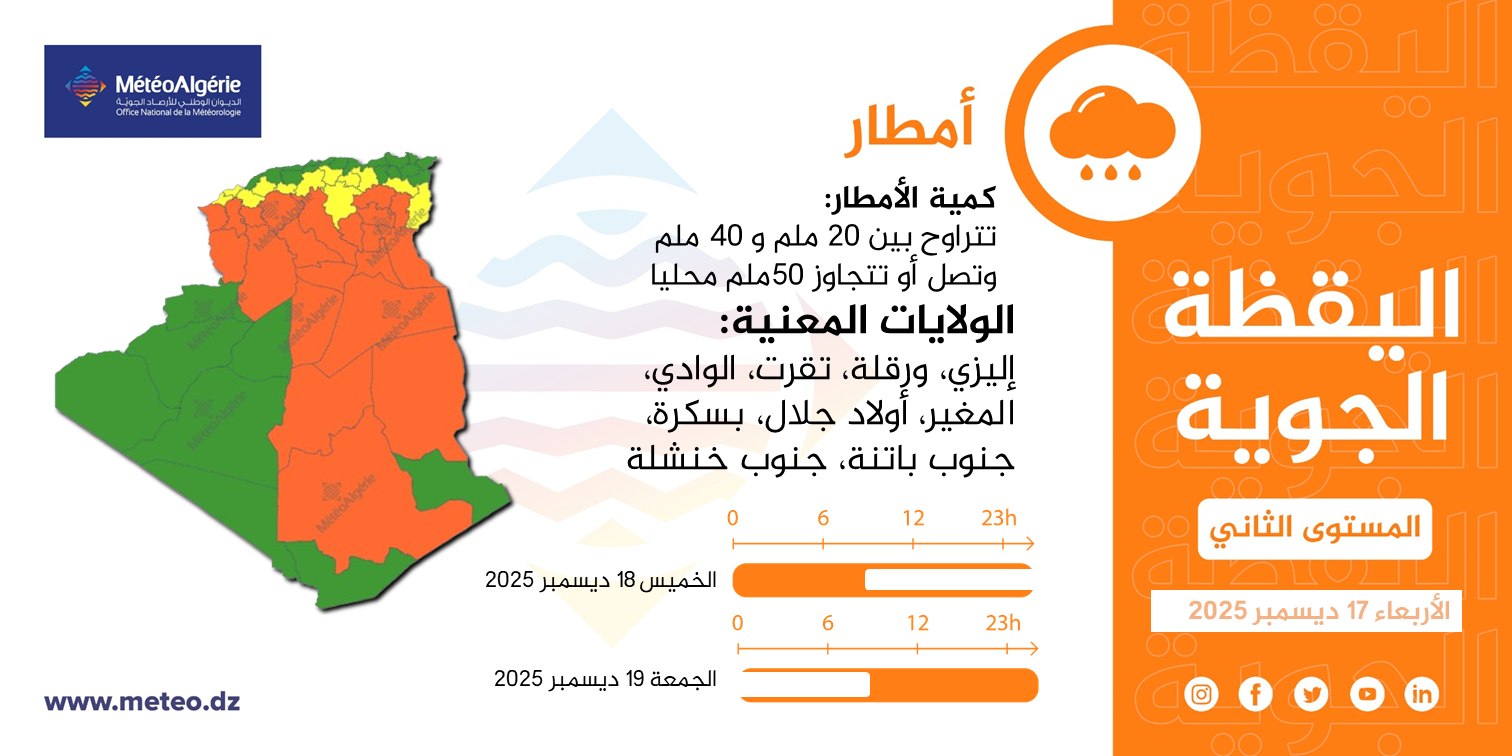 وحسب تنبيه آخر للديوان من المستوى الثاني باللون البرتقالي على خريطة اليقظة، ستتساقط الأمطار التي تتراوح بين 20 ملم و40 ملم وقد تصل أو تتجاوز محليا الـ 50 ملم بداية من الساعة التاسعة صباحا من اليوم الخميس لغاية الساعة التاسعة صباحا من يوم غد الجمعة على ولايات: إليزي، ورقلة، تقرت، الوادي، المغير، أولاد جلال، بسكرة، جنوب باتنة وجنوب خنشلة.