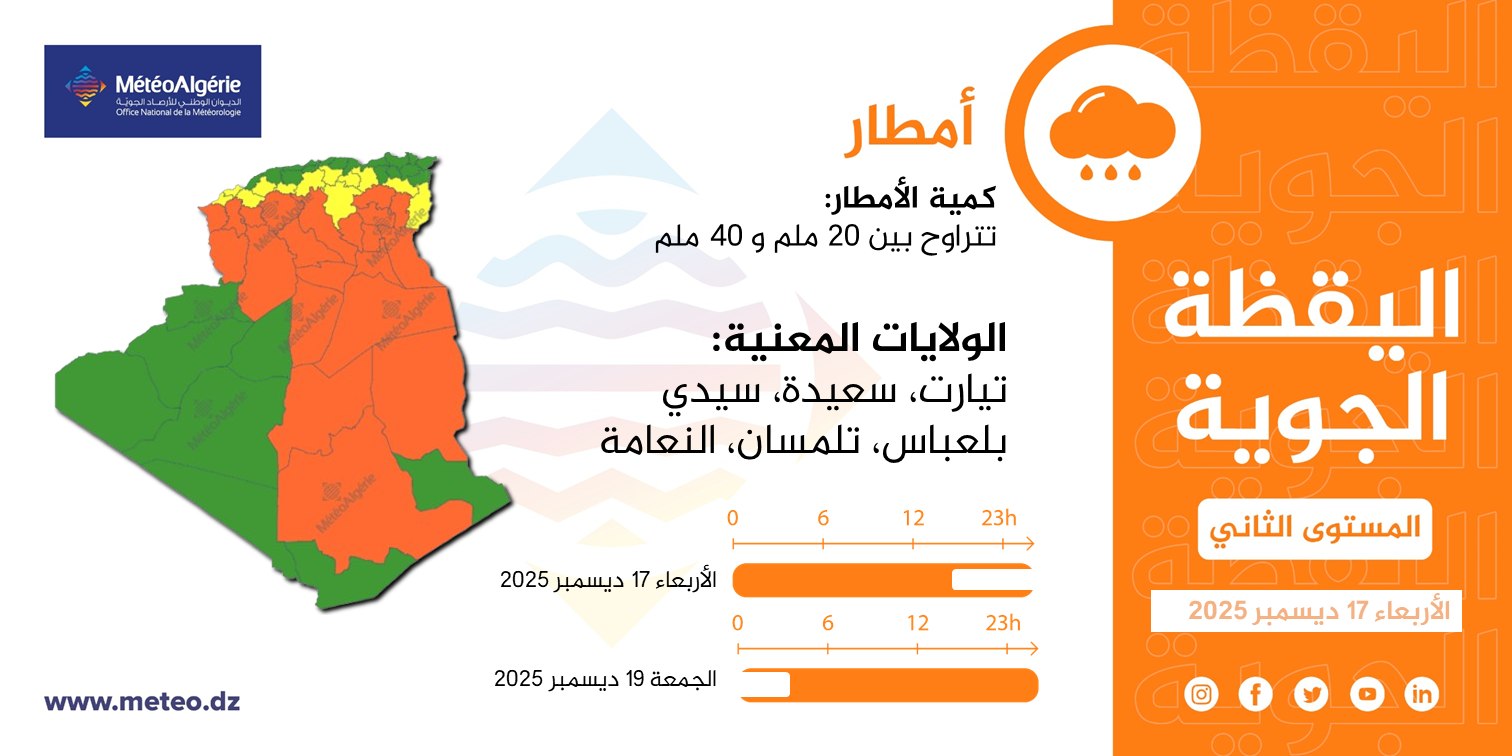 وفي نشرية أخرى من المستوى الثاني باللون البرتقالي على خريطة اليقظة ستتساقط الأمطار التي تتراوح بين 20 ملم و40 على ولايات: تيارت، سعيدة، سيدي بلعباس، تلمسان والنعامة إلى غاية الساعة الثالثة صباحا من يوم غد الجمعة.